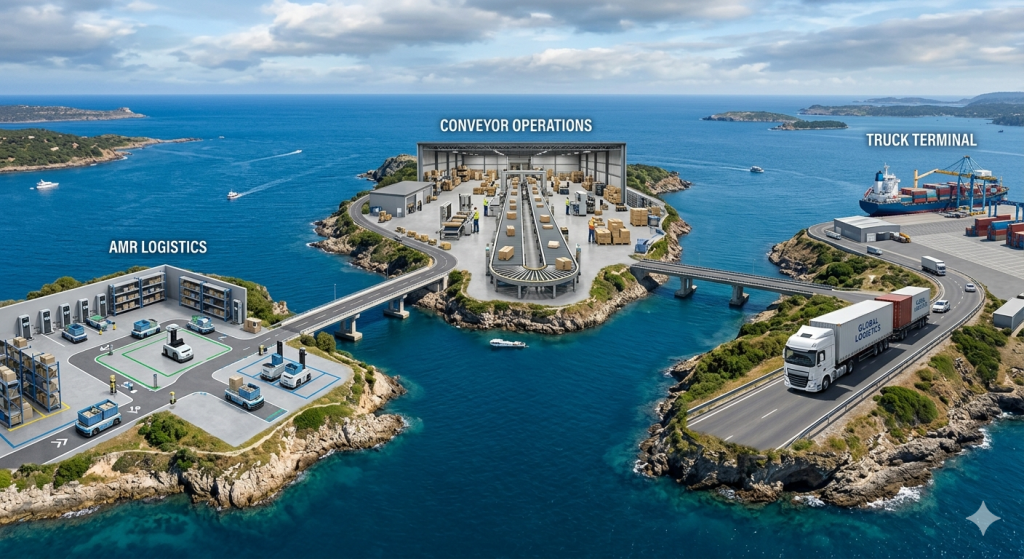 Beneath the surface, most large warehouses are not one intelligent system. They are several separate systems, each with its own data model, its own optimization engine, and its own definition of success. They share a roof, but often very little else. This is what supply chain practitioners call the island problem and it is one of the most consequential, least discussed sources of inefficiency in modern logistics.